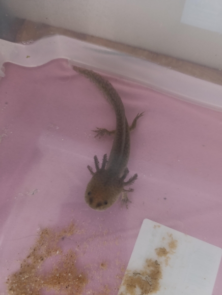 Hallo, ich habe mir einen kleinen Axolotl nach gekauft . Ich habe in seit Februar 2025 und bekommen habe ich ihn mit 10cm und er hat immer noch 10cm. Er ist pellet fest und Bd Test ist negativ.